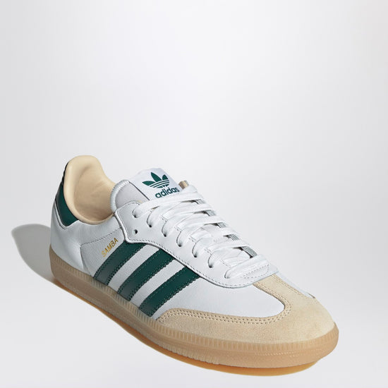 White leather sneaker from adidas Originals featuring rounded toe, green side bands, lace-up closure, green heel, logoed tongue and natural rubber sole.