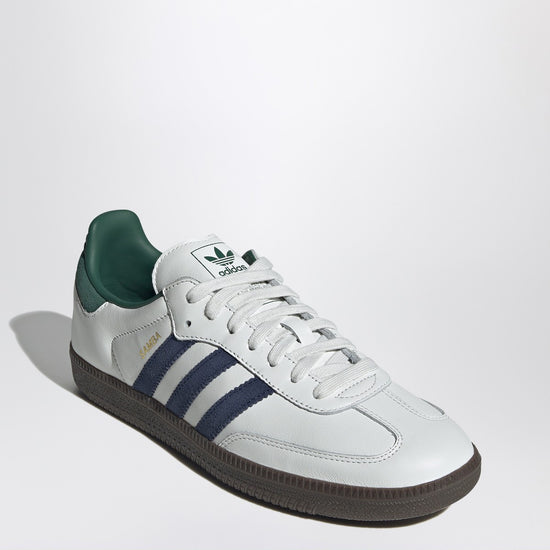 White leather sneaker from adidas Originals featuring rounded toe, blu side bands, lace-up closure, green heel, logoed tongue and natural rubber sole.