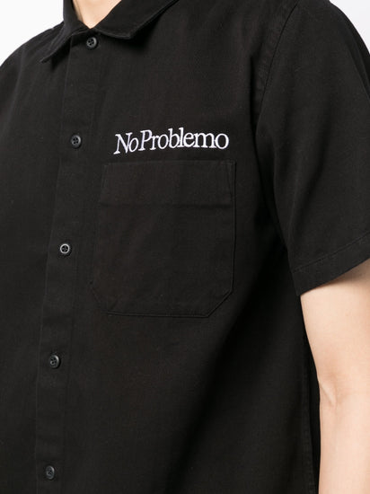 slogan-embroidered cotton shirt from ARIES featuring black, cotton, embroidered slogan, mini logo tag, classic collar, front button fastening, short sleeves and straight hem. Logo short sleeves shirt Size and Fit - This piece fits true to size. We recommend you get your regular size. Model is 1,84m / 6ft 1in wearing size M