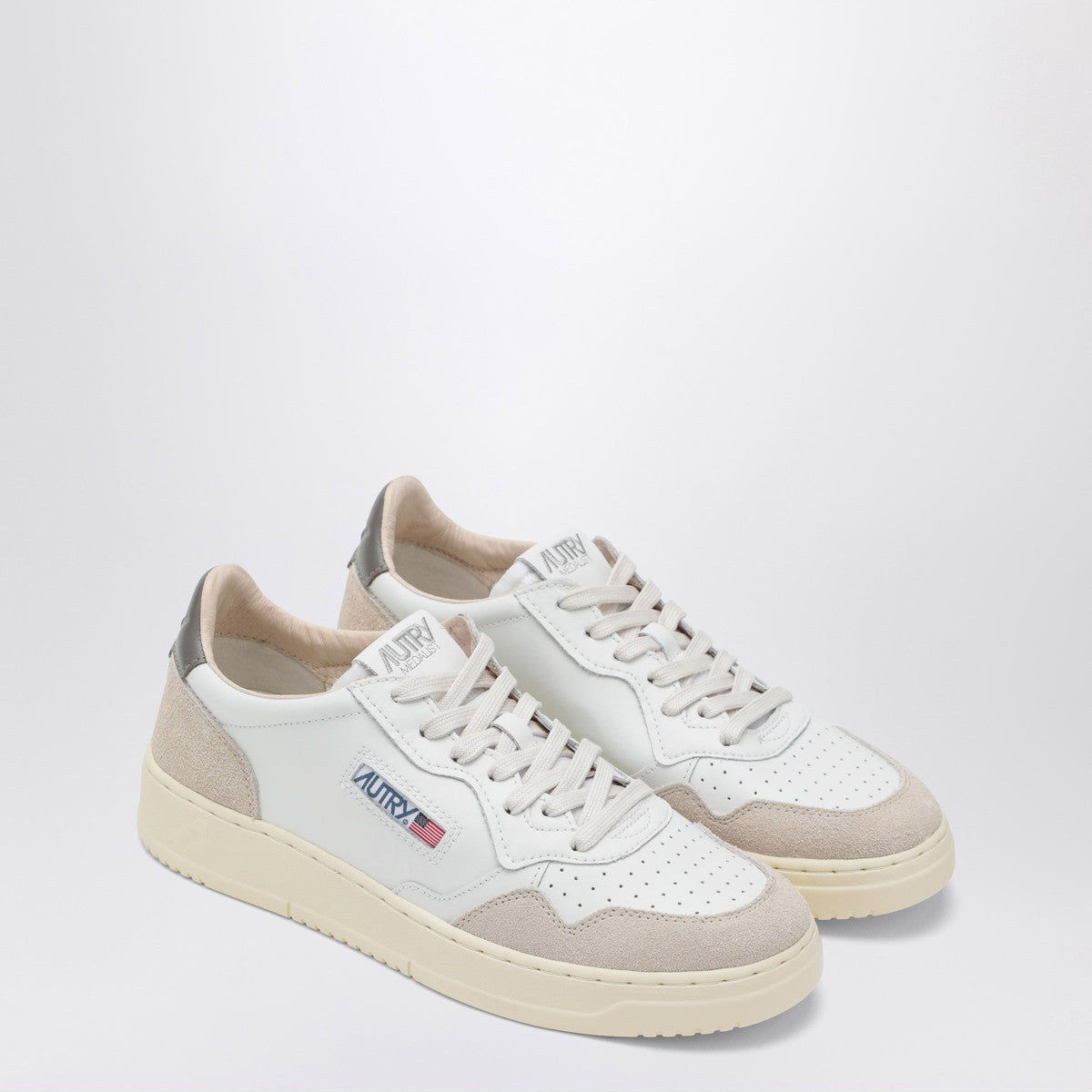 White leather sneaker from Autry featuring a rounded, perforated toe, grey heel on the back in a contrasting colour, a lace-up closure and a padded tongue.