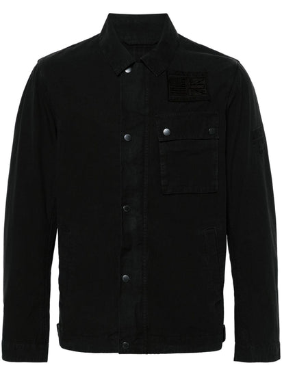 black cotton ripstop texture logo patch at the chest embroidered logo at the sleeve classic collar front press-stud fastening concealed front zip fastening press-stud fastening cuffs stud-fastening chest pocket two side slit pockets unlined adjustable side straps straight hem Workers cotton jacket Size and Fit - This piece fits true to size. We recommend you get your regular size. Model is 1,84m / 6ft 1in wearing size M