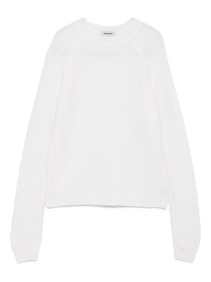 white raglan sleeves round neck long sleeves ribbed cuffs Wool crewneck sweater