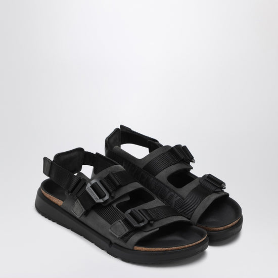 Sandal by Birkenstock in natural leather and black fabric, featuring anatomical cork and latex footbed, double adjustable hook-and-loop fastener, heel strap and polyurethane sole.
