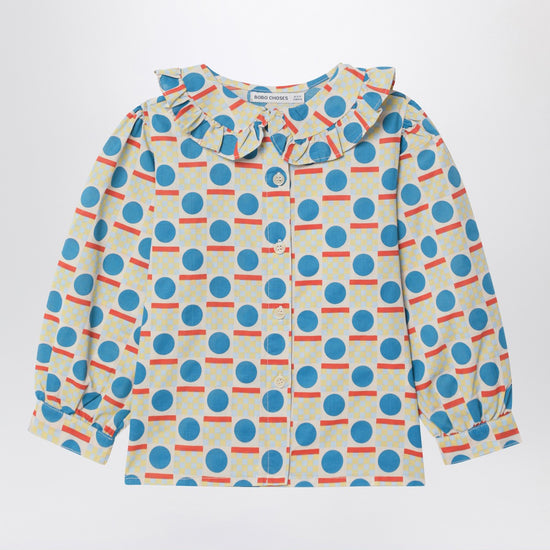 Bobo Choses blouse in organic cotton with colourful all-over geometric print, featuring long sleeves, one with logo embroidery, front buttoning, and a Peter Pan collar.