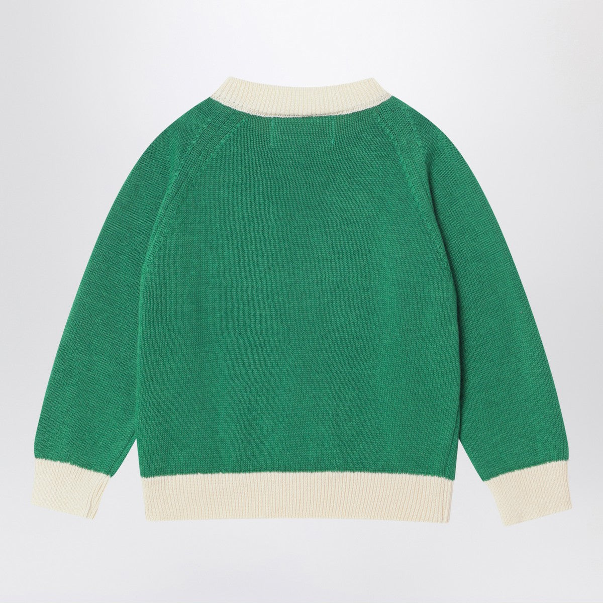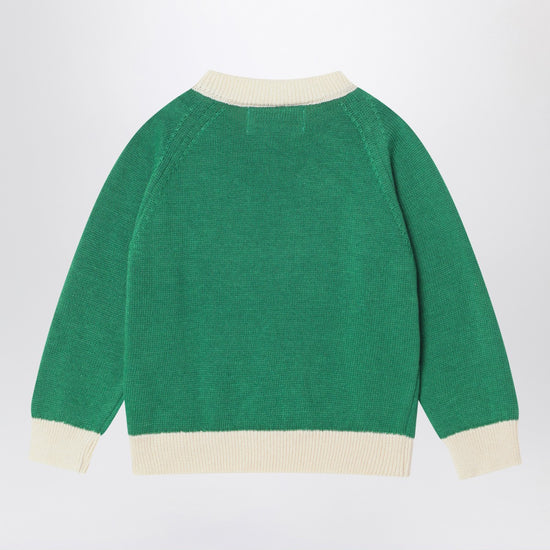Bobo Choses crew neck sweater in organic cotton green and white, featuring long sleeves with one having a logo embroidery on the wrist, ribbed edges, buttons on the front, and an intarsia on the chest.