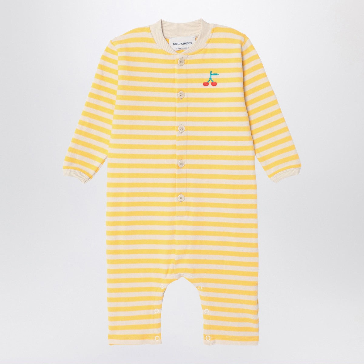 Ivory and yellow striped organic cotton terry sleepsuit from Bobo Choses featuring long sleeves, ribbed hems, buttons on the front, snap fastening at the crotch and embroidered cherry on the chest.