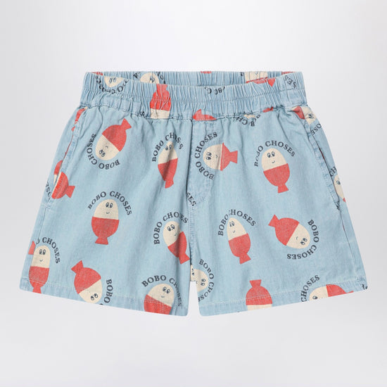Shorts by Bobo Choses in light blue cotton, characterized by an elasticated waist, two side welt pockets, one applied pocket on the back, and all-over logo lettering with Morning Egg.