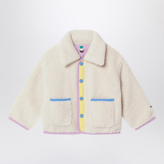Reversible Bobo Choses jacket, characterized by long sleeves with one featuring a logo, front button closure, lavender colour with print on one side, shearling effect fabric on the other, and two applied pockets on the front.
