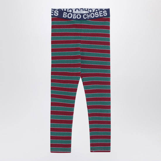 Bobo Choses leggings in a cotton blend with green and burgundy stripes, featuring an elasticated waistband with contrasting logo lettering and ribbed design.