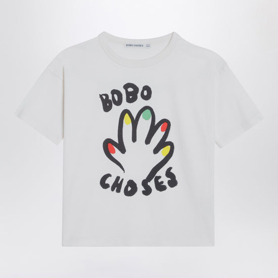 Bobo Choses white organic cotton T-shirt, featuring short sleeves, ribbed crew neck, and contrasting hand logo lettering print on the front.