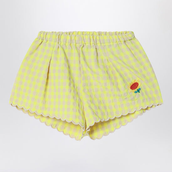 Shorts by Bobo Choses in cotton blend with yellow Vichy pattern, featuring an elasticated waist, flower embroidery on the front, and wavy hem.