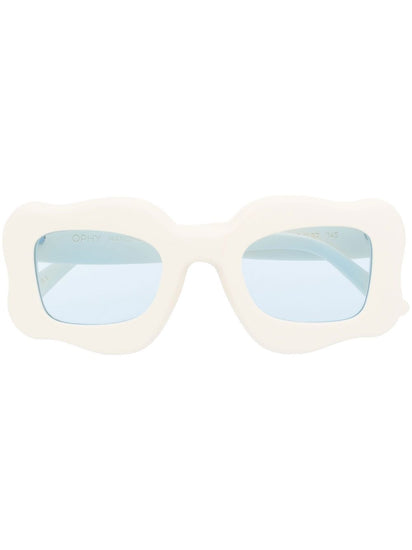 oversized curved-frame sunglasses from Bonsai featuring white, oversize frame, curved corners, blue tinted lenses, logo print at the arm and straight arms. These glasses come with a protective case.. Happy sunglasses Size and Fit - Arm Length: 14.5 Centimetres. Bridge Width: 2.7 Centimetres. Lens Diameter: 4.8 Centimetres. Total Width: 13.5 Centimetres.