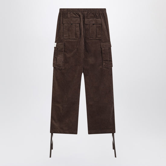 Brown corduroy cotton cargo trousers from Brain Dead featuring an elasticated waistband, two side welt pockets, two patch pockets with flap and logo patch on the side, two patch pockets with flap on the back and a drawstring at the leg bottom.