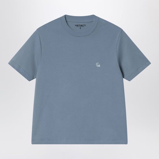 Carhartt WIP T-shirt in angelite blue interlock cotton knit, featuring short sleeves, slim fit, ribbed crew neck, and tone-on-tone logo embroidery on the chest. Size and Fit - Model wears size X S Model measurements: Height: 178 cm Chest: 83 cm Waist: 63 cm Hips: 91 cm