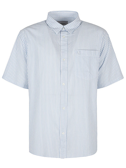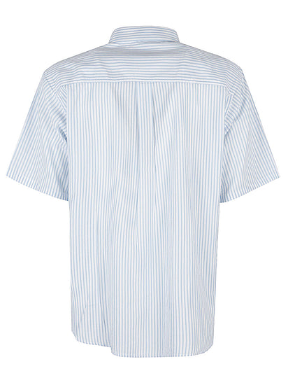 White and light blue striped shirt, straight hem. Cotton shirt Size and Fit - This piece fits true to size. We recommend you get your regular size. Model is 1,84m / 6ft 1in wearing size M