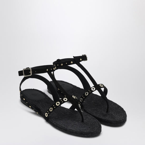 Low sandal by Castañer with black raffia upper, characterized by flip-flop design, stud detail, ankle strap with side buckle closure, raffia insole, and jute and rubber sole.