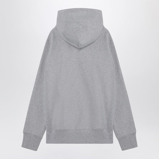 Light grey cotton sweatshirt from Champion, featuring a hood with drawstring, a kangaroo pocket on the front, long sleeves with a small logo patch on the wrist and ribbed edges.