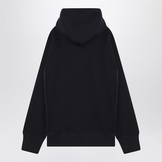 Navy blue cotton sweatshirt from Champion, featuring a hood with drawstring, a kangaroo pocket on the front, long sleeves with a small logo patch on the wrist and ribbed edges.
