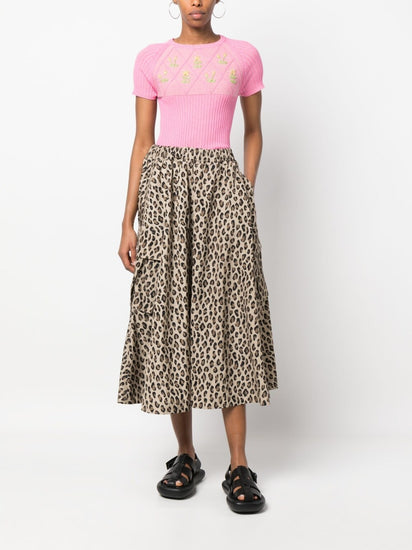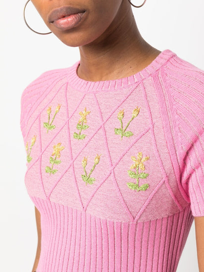 floral embroidery-detail knit top from CORMIO featuring rose pink, cotton blend, metallic threading, ribbed knit, diamond pattern, floral embroidery to the front, crew neck, short sleeves and straight hem. Embroidered cotton t-shirt Size and Fit - This piece fits true to size. We recommend you get your regular size. Model is 1,75m / 5ft 8in wearing size 40 (IT)