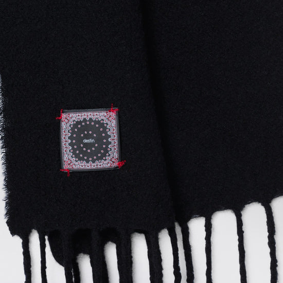 Black wool and cashmere scarf by Destin Surl featuring fringed edges and a bandana logo tag.