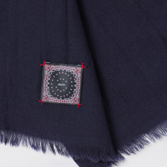 Navy blue wool scarf by Destin Surl, featuring fringed edges and bandana logo tag.