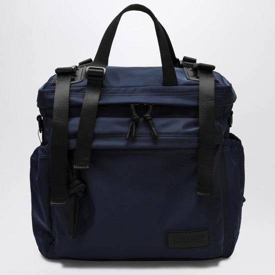 Backpack by DONE! made of blue waterproof recycled nylon, it features a horizontal design, a zip fastening, a main compartment, a front zipped pocket, two side pockets with drawstring, a padded inner pocket, an inner mesh pocket with a key clip, a security pocket on the back, removable padded shoulder straps, contrasting lining and a removable inner pocket. Size and Fit - Width 34 cm x Height 34 cm x Depth 15 cm