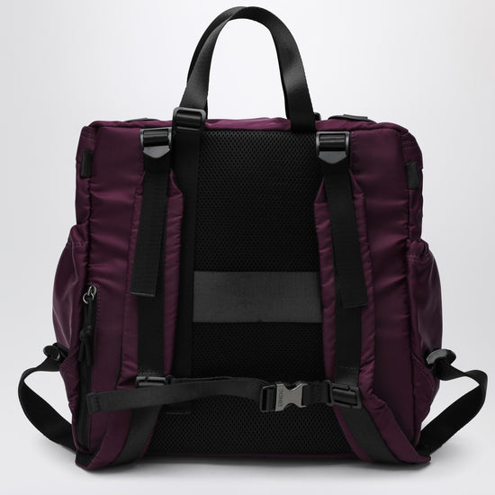 Backpack by DONE! made of burgundy waterproof recycled nylon, it features a horizontal design, a zip fastening, a main compartment, a front zipped pocket, two side pockets with drawstring, a padded inner pocket, an inner mesh pocket with a key clip, a security pocket on the back, removable padded shoulder straps, contrasting lining and a removable inner pocket. Size and Fit - Width 34 cm x Height 34 cm x Depth 15 cm
