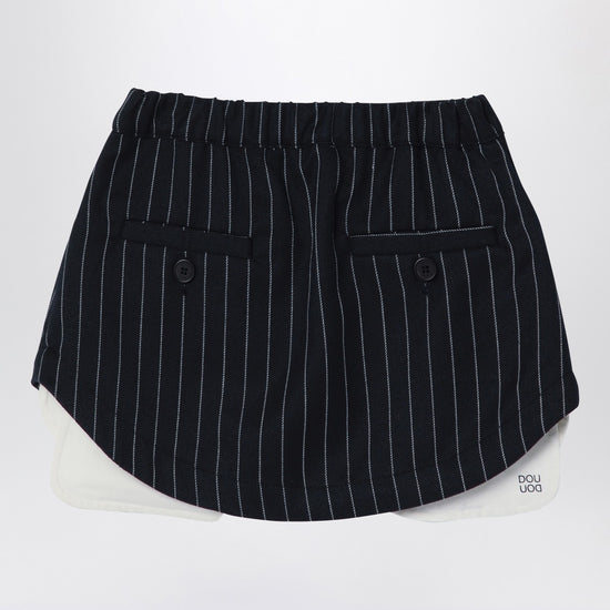 Navy blue viscose blend pinstripe pattern skirt from Douuod featuring visible logo lettering lining, elasticated waist, two side welt pockets, two back welt pockets with button and curved hem.