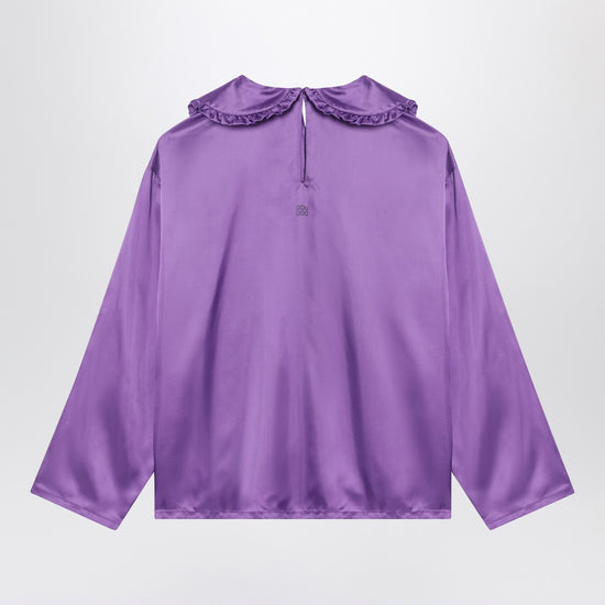 Purple viscose satin blouse by Douuod, featuring long sleeves, a Peter Pan collar, a back logo lettering, and a button closure at the back.