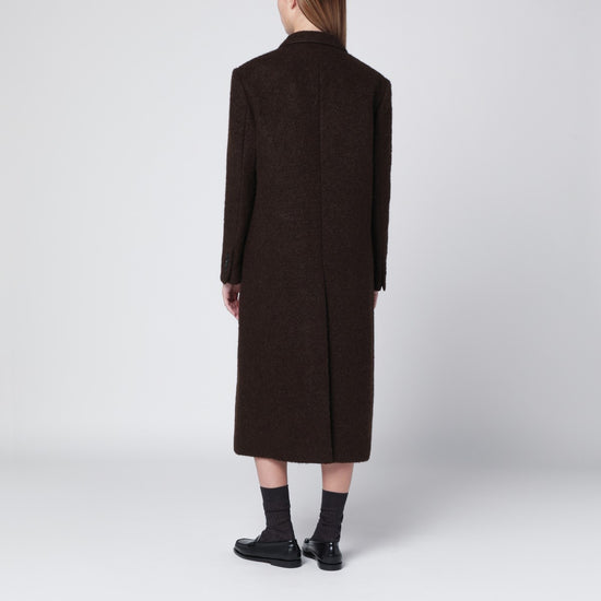 Dunst single-breasted coat in brown wool-alpaca blend, featuring classic lapels, one chest welt pocket, two front flap pockets, button closure, long sleeves with buttoned cuffs, and back vent. Size and Fit - Model wears size S Model measurements: Height: 182 cm Chest: 79 cm Waist: 62 cm Hips: 90 cm