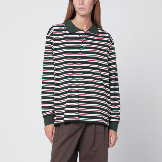 Dark green striped cotton polo, featuring long sleeves, front buttons, contrasting logo lettering embroidery on the chest, and ribbed cuffs. Size and Fit - Model wears size S Model measurements: Height: 182 cm Chest: 79 cm Waist: 62 cm Hips: 90 cm