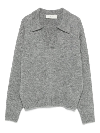 grey V-neck polo collar long sleeves knitted construction ribbed hem Wool blend polo sweater