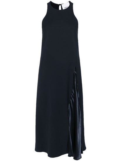 navy blue cady texture crew neck sleeveless satin trim straight hem mid-length single rear button fastening Sleeveless midi dress Size and Fit - This piece fits true to size. We recommend you get your regular size. Model is 1,75m / 5ft 8in wearing size 40 (IT)