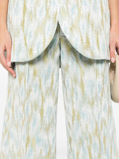 silver-tone/sunflower yellow/sky blue metallic threading patterned jacquard belt loops pressed crease two side inset pockets rear welt pocket cropped wide leg concealed fly and button fastening Printed cropped trousers Size and Fit - This piece fits true to size. We recommend you get your regular size. Model is 1,75m / 5ft 8in wearing size 40 (IT)