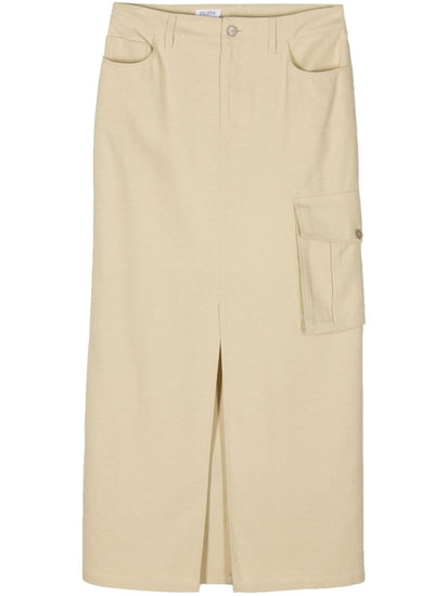 sesame beige lyocell crepe texture tonal stitching classic five pockets side cargo pocket front slit full-length straight hem concealed fly and button fastening Crepe cargo skirt Size and Fit - This piece fits true to size. We recommend you get your regular size. Model is 1,75m / 5ft 8in wearing size 36 (FR)