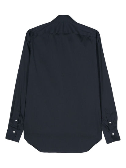navy blue cotton blend classic collar long sleeves with buttoned cuffs curved hem front button fastening Regular fit cotton shirt Size and Fit - This piece fits true to size. We recommend you get your regular size. Model is 1,84m / 6ft 1in wearing size 39 (COLLAR CM)