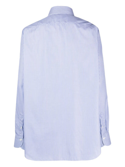 Blue shirt, striped, buttons closure. Striped cotton shirt Size and Fit - This piece fits true to size. We recommend you get your regular size. Model is 1,84m / 6ft 1in wearing size 39 (COLLAR CM)