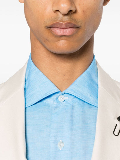 sky blue cotton-linen blend spread collar long sleeves with buttoned cuffs curved hem front button fastening Cotton and linen blend shirt Size and Fit - This piece fits true to size. We recommend you get your regular size. Model is 1,84m / 6ft 1in wearing size 39 (COLLAR CM)