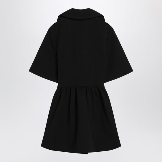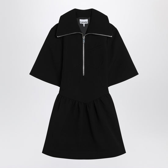 Mini dress by Ganni in recycled polyester crêpe with textured black finish, featuring a silver zip at the front, a wide high collar, short sleeves, two side welt pockets, flared ruffled skirt, and a welt pocket on the chest. Size and Fit - Model wears size 34 FR Model measurements: Height: 179 cm Chest: 82 cm Waist: 65 cm Hips: 90 cm