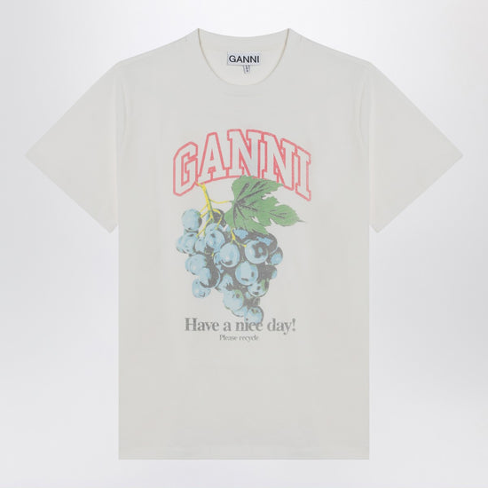 Ganni T-shirt in ivory organic cotton, featuring short sleeves, logo lettering print and grape cluster on the front, ribbed crew neck and relaxed fit. Size and Fit - Model wears size S Model measurements: Height: 179 cm Chest: 82 cm Waist: 65 cm Hips: 90 cm