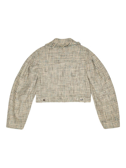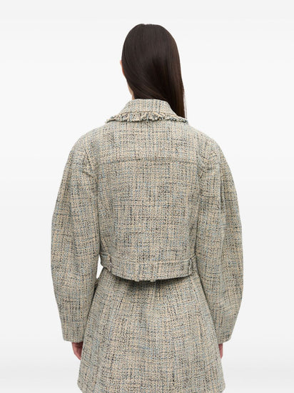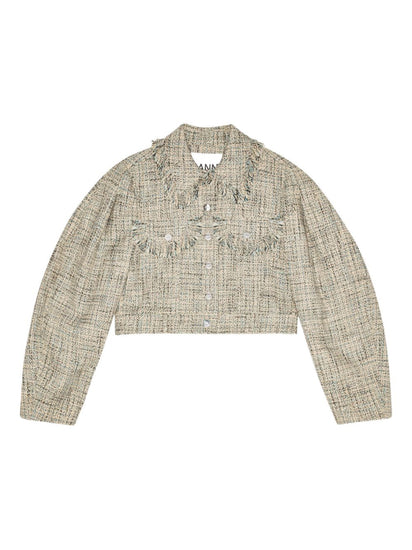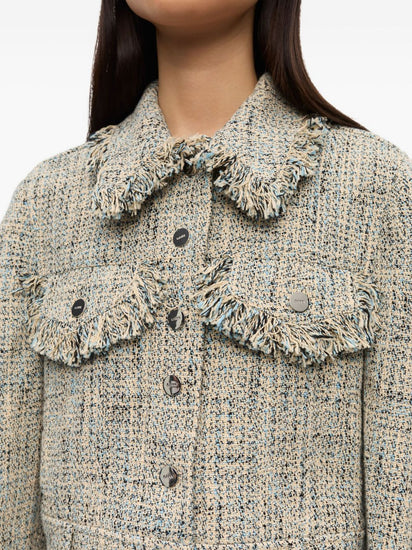 light beige front button fastening two button-fastening chest pockets frayed detailing pointed flat collar Tweed jacket