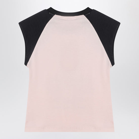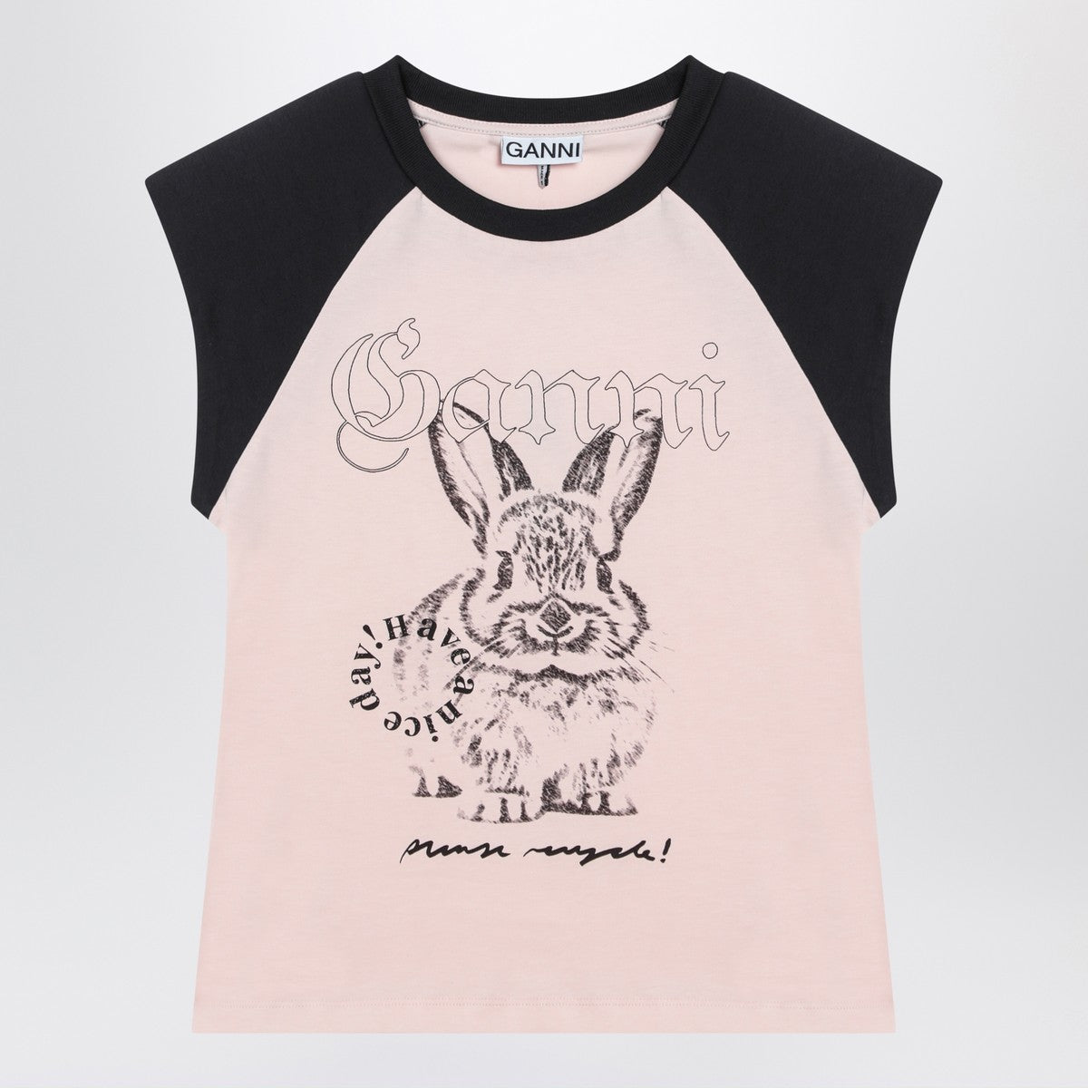 Ganni T-shirt in organic cotton pink, featuring a ribbed crew neck, contrasting logo print on the front, and short sleeves with structured shoulders. Size and Fit - Model wears size S Model measurements: Height: 179 cm Chest: 82 cm Waist: 65 cm Hips: 90 cm