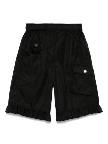black elasticated waistband two side inset pockets two side cargo pockets ruffle hem Nylon shorts