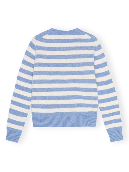 blue pinstripe pattern ribbed band collar long sleeves embroidered logo to the front ribbed cuffs and hem Embroidered striped wool sweater Size and Fit - This piece fits true to size. We recommend you get your regular size. Model is 1,75m / 5ft 8in wearing size S