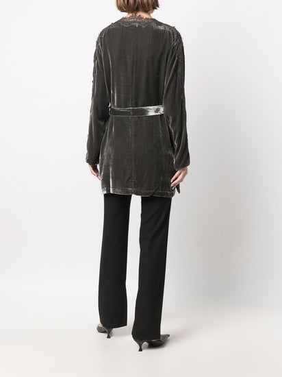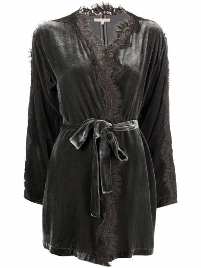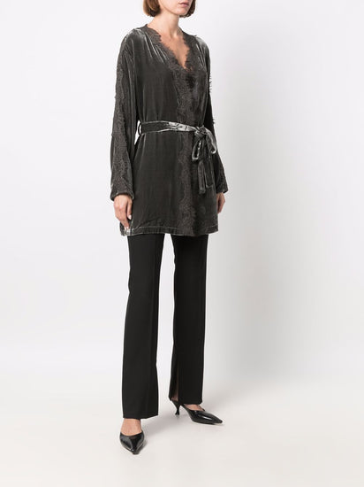 Dark grey lace-trim belted coat from GOLD HAWK featuring lace trim, V-neck, long sleeves, tied waist and two side slit pockets. Velvet long duster Size and Fit - This piece fits true to size. We recommend you get your regular size. Model is 1,75m / 5ft 8in wearing size S