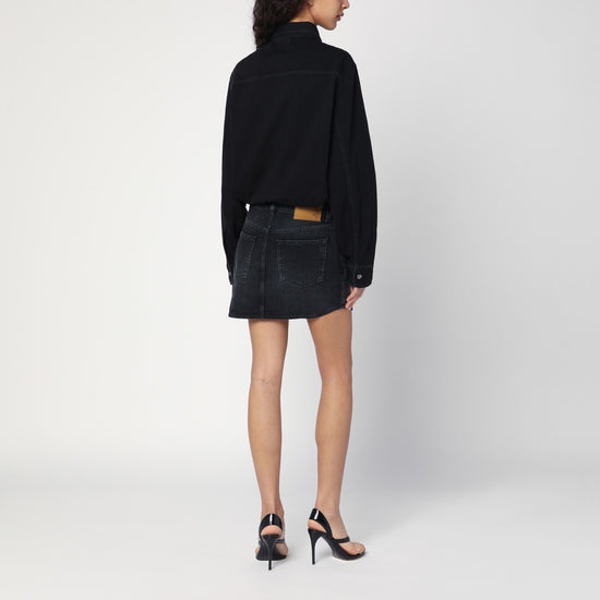 Mini dress by Haikure in black cotton denim with a faded effect, characterized by a shirt design on the top and a mini skirt design on the bottom, front button closure, classic collar, long sleeves with buttoned cuffs, a patch pocket on the chest, and a logo patch on the back. Size and Fit - Model wears size S Model measurements: Height: 180 cm Chest: 85 cm Waist: 66 cm Hips: 89 cm