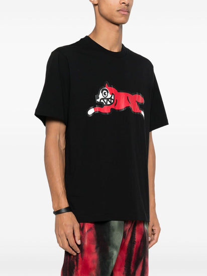 jet black cotton jersey texture graphic print to the front logo print to the rear crew neck short sleeves straight hem Running Dog cotton t-shirt