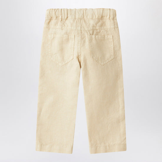 Beige linen pants by Il Gufo, characterized by an elasticized waist with drawstring, two front pockets, and two applied pockets on the back.