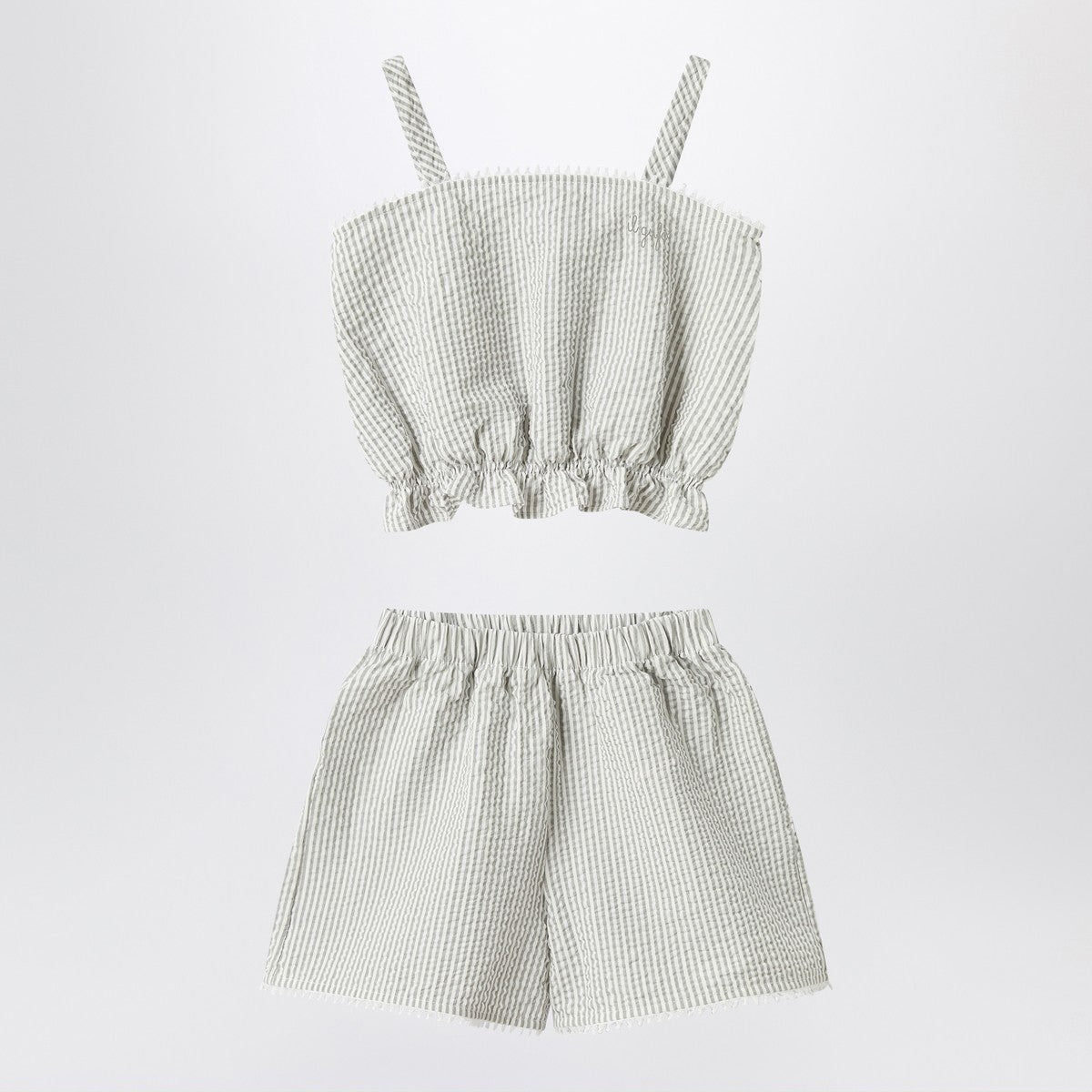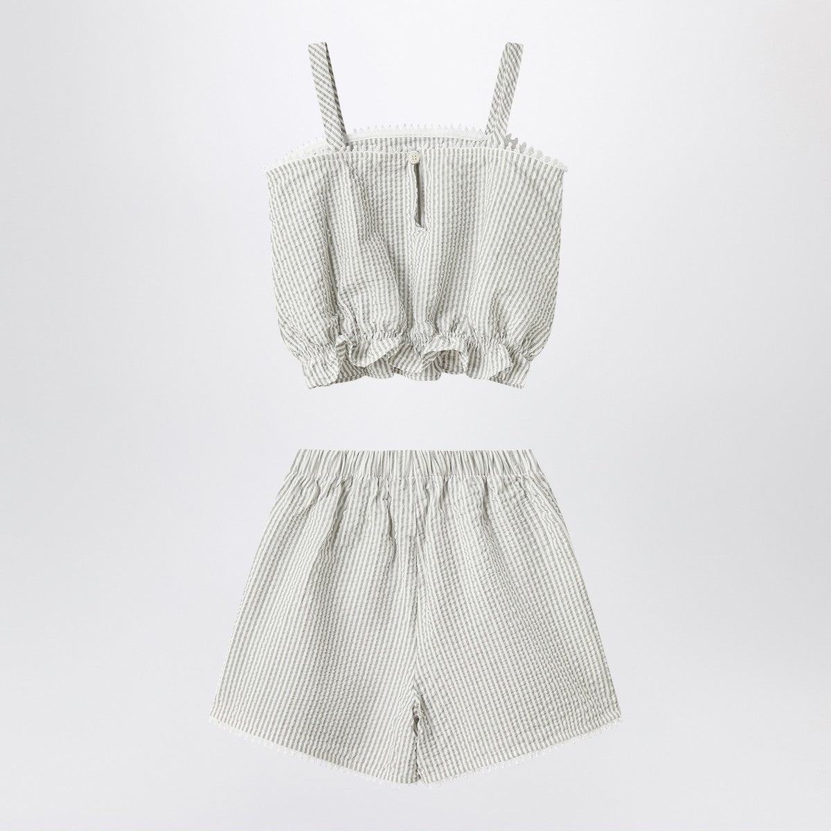 Set by Il Gufo in seersucker with a granite colour striped pattern, consisting of a top with a soft line, straps, a button on the back, and an elasticized bottom, and bermuda shorts with an elastic waistband.