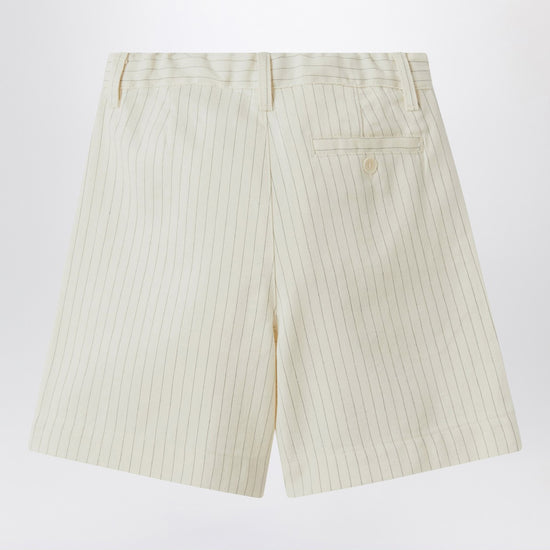 Bermuda by Il Gufo in white cotton blend with pinstripe pattern, featuring a front closure with zip and button, adjustable elastic waistband, belt loops, two side welt pockets, and one welt pocket with button at the back.
